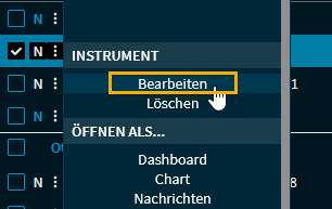 Öffnen Sie im Widget "Kursliste" in der Übersicht in der Zeile mit der zu bearbeitenden Position über das Menü-Icon das Menü und wählen Sie dort den Befehl INSTRUMENT BEARBEITEN.