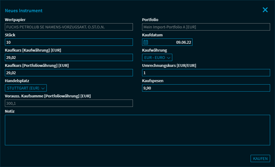 Schließen Sie den Ankauf mit dem Button "Kaufen" ab. Das Wertpapier erscheint mit den eingegebenen Daten als Position im Portfolio.