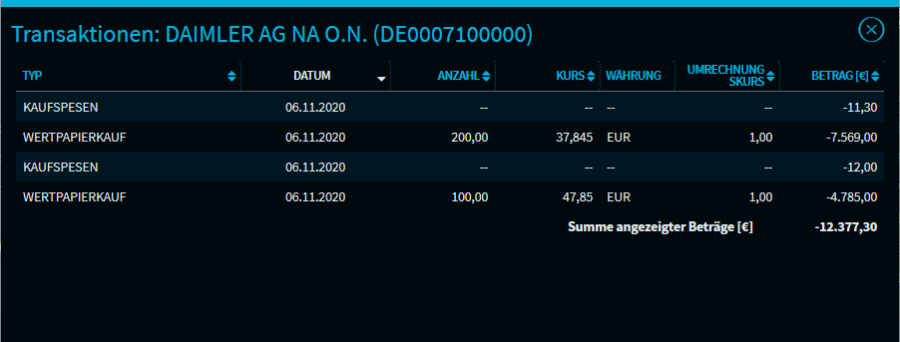 Nach Bestätigung sind die ausgewählten Positionen zu einer zusammengeführt. D. h., die Transaktionen sind zusammengeführt, Kaufspesen und Dividenden aufsummiert und der resultierende Kaufkurs entsprechend den Verhältnissen berechnet.