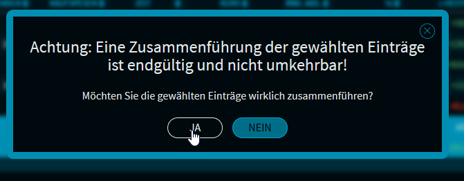 Nach Auswahl von "Zusammenführen" erfolgt ein Hinweis, dass diese Aktion nicht mehr rückgängig gemacht werden kann. Bestätigen Sie diesen mit "JA".