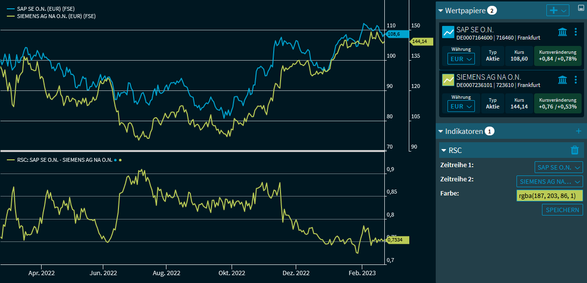 Der Relative Strength Comparative (Abkürzung "RSC") ermöglicht den direkten Vergleich zweier Wertpapiere oder den Vergleich eines Wertpapiers mit einer Benchmark.