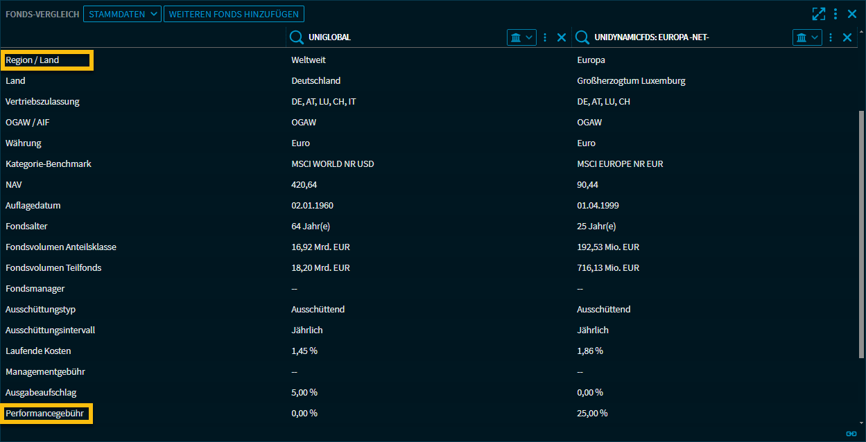 Im Widget "Fonds-Vergleich" stehen Ihnen in der Ansicht "Stammdaten" die beiden neuen Felder "Region/Land" und "Performancegebühr" zur Verfügung.