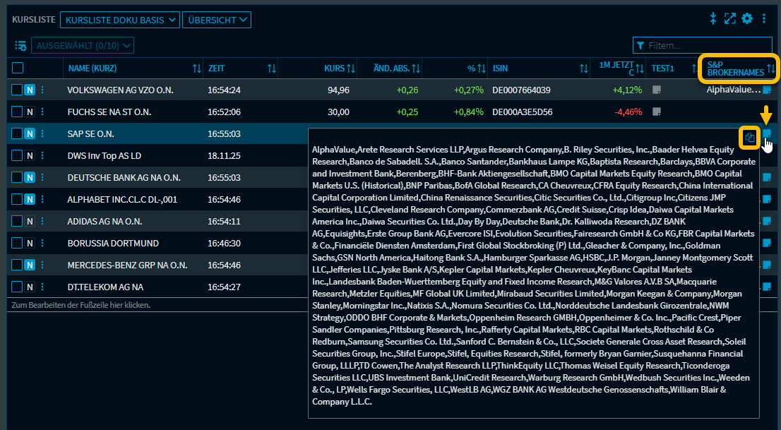 In diesem Bildbeispiel wurde einer Kursliste die Spalte "S&P Brokernames" per Drag&Drop hinzugefügt.