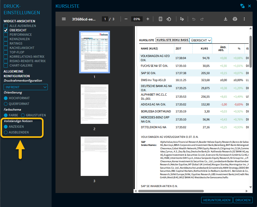 Beim Drucken des Widgets werden die langen Texte nach der Tabelle als Textblock angezeigt. Diese Anzeige kann auf der linken Seite mithilfe der Einstellung "Vollständige Notizen" auch ausgeblendet werden.
