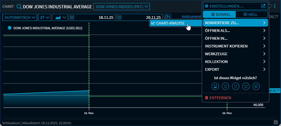 Es ist nun möglich, ein vorhandenes Widget "Chart" in ein Widget "Chart-Analyse" umzuwandeln. Damit haben Sie die Möglichkeit, die erweiterten Analyse-Funktionen der Chart-Analyse zu nutzen und die vorhandenen Einstellungen zu übernehmen.