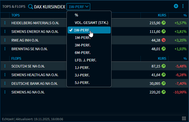 Im Widget "Tops & Flops" wurde in der Auswahlliste für die Performance-Zeiträume der Zeitraum "1-Woche-Performance" hinzugefügt.