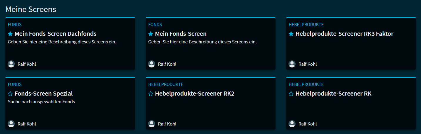 Über die Liste der eigenen Screens öffnen Sie einen Screen per Mausklick auf die Kachel auf der Screener-Startseite. Hier finden Sie direkt die zuletzt hinzugefügten Screens.