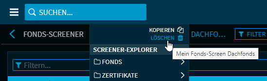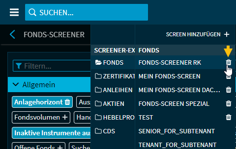 Ihre selbst angelegten Screens können Sie auch wieder löschen. Wählen Sie dazu im Screener-Explorer das Löschen-Icon des Screens und beantworten Sie die erscheinende Sicherheitsabfrage mit "Ja".