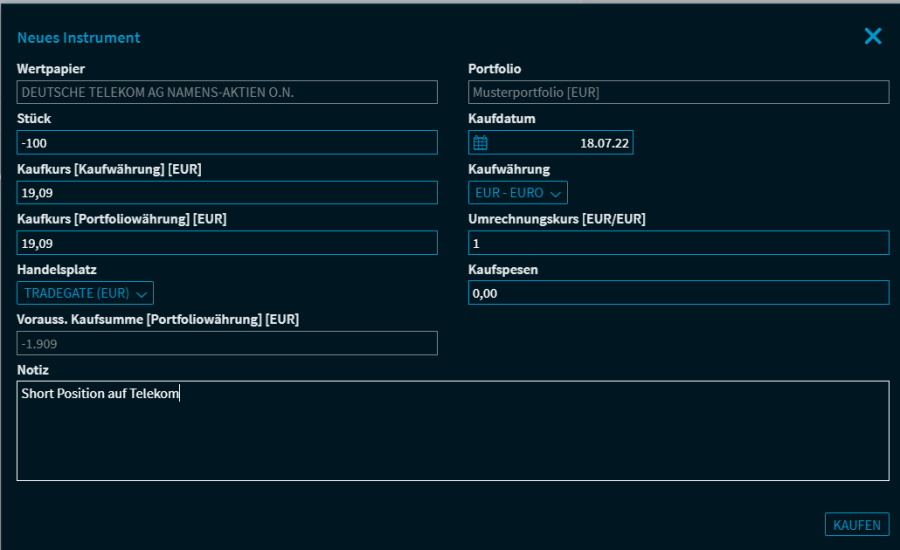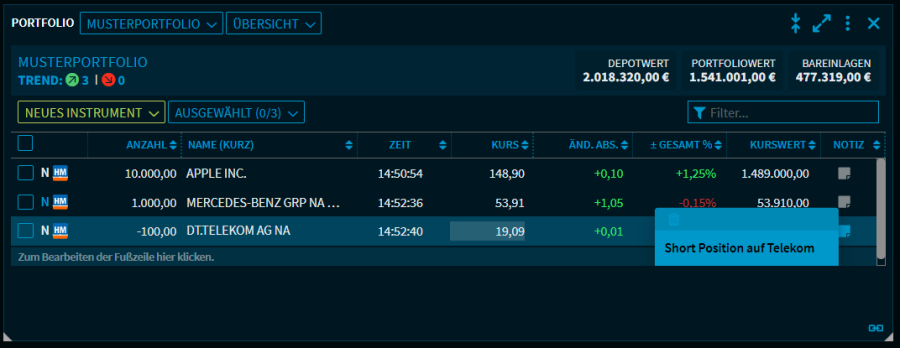 Im Widget "Portfolio" ist es auch möglich, Short-Positionen abzubilden. Geben Sie dazu beim Kauf einfach eine negative Stückzahl ein. Eine Beschränkung auf bestimmte Assetklassen gibt es dabei nicht. Es können also sowohl Short-Future-Positionen als auch z. B. Leerverkäufe mit Aktien abgebildet werden.