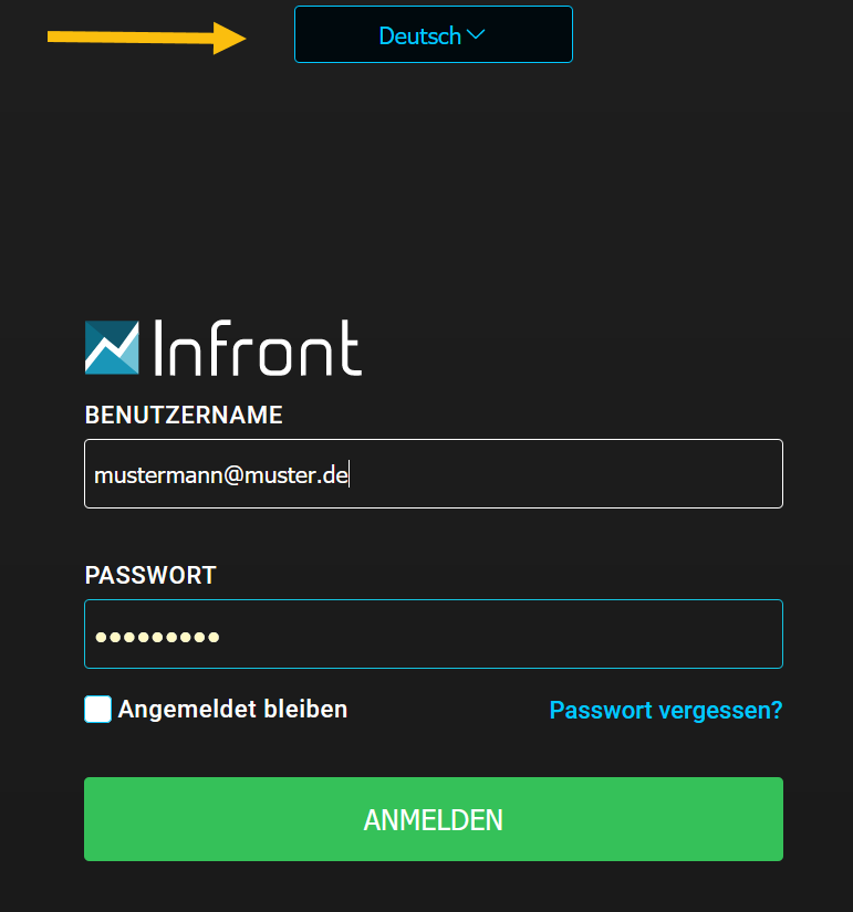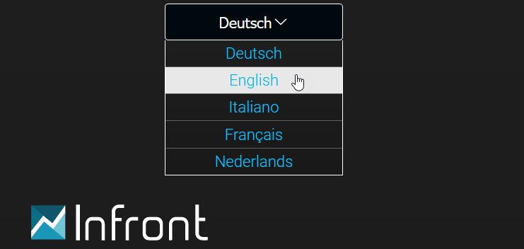 Auf der Anmeldeseite Ihres Infront Investment Manager können Sie eine Sprache auswählen. Aktuell stehen die folgenden Sprachen zur Auswahl: