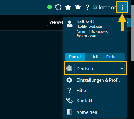Alternativ zur Anmeldeseite können Sie auch im geöffneten jederzeit die Sprache wechseln. Dazu finden Sie im Einstellungsmenü eine entsprechende Auswahlliste: