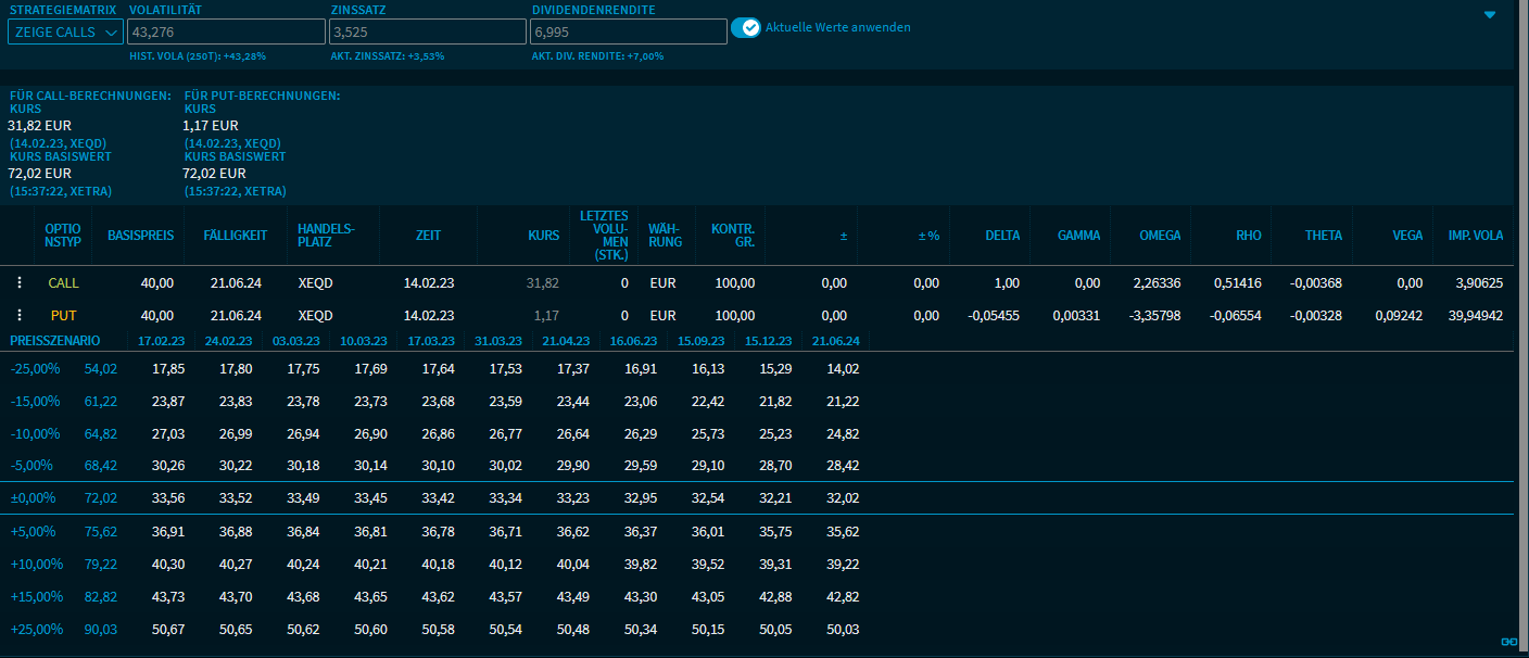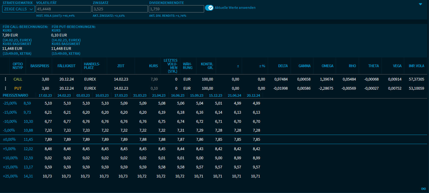 Abhängig davon werden dann die einzelnen Preisszenarien für den in der Optionsliste ausgewählten Basispreis bzw. für die ausgewählte Fälligkeit berechnet.