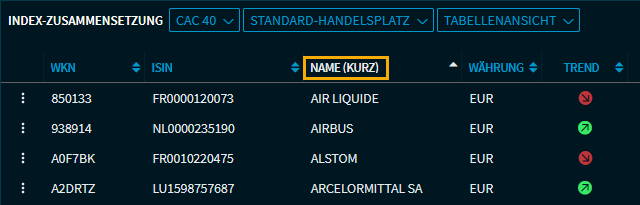 In vielen Widgets finden Sie Tabellen zur Darstellung der Inhalte. Prominente Beispiele hierfür sind die Standardansichten der Widgets "Portfolio" und "Kursliste". Diese Tabellen können Sie nach Spalten sortieren, indem Sie auf die Spaltenüberschrift klicken. Ein erneuter Mausklick auf die gleiche Spaltenüberschrift kehrt die Sortierung um. Spalten, nach denen die Tabelle sortiert werden kann, erkennen Sie an den Pfeilsymbolen in den Spaltenüberschriften. Die aktuelle Sortierung wiederum erkennen Sie an der farblich hervorgehobenen Spaltenüberschrift.