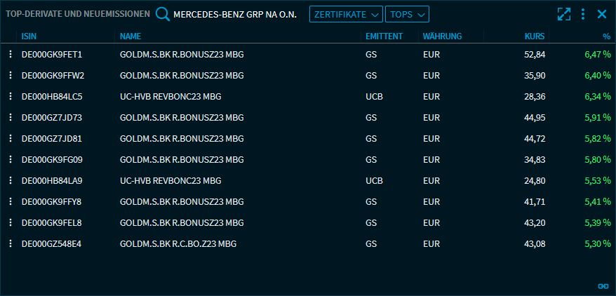 In diesem Beispiel sind die 10 Top-Zertifikate auf den DAX aufgelistet, absteigend nach der prozentualen Veränderung gegenüber dem Vortagesschlusskurs sortiert.