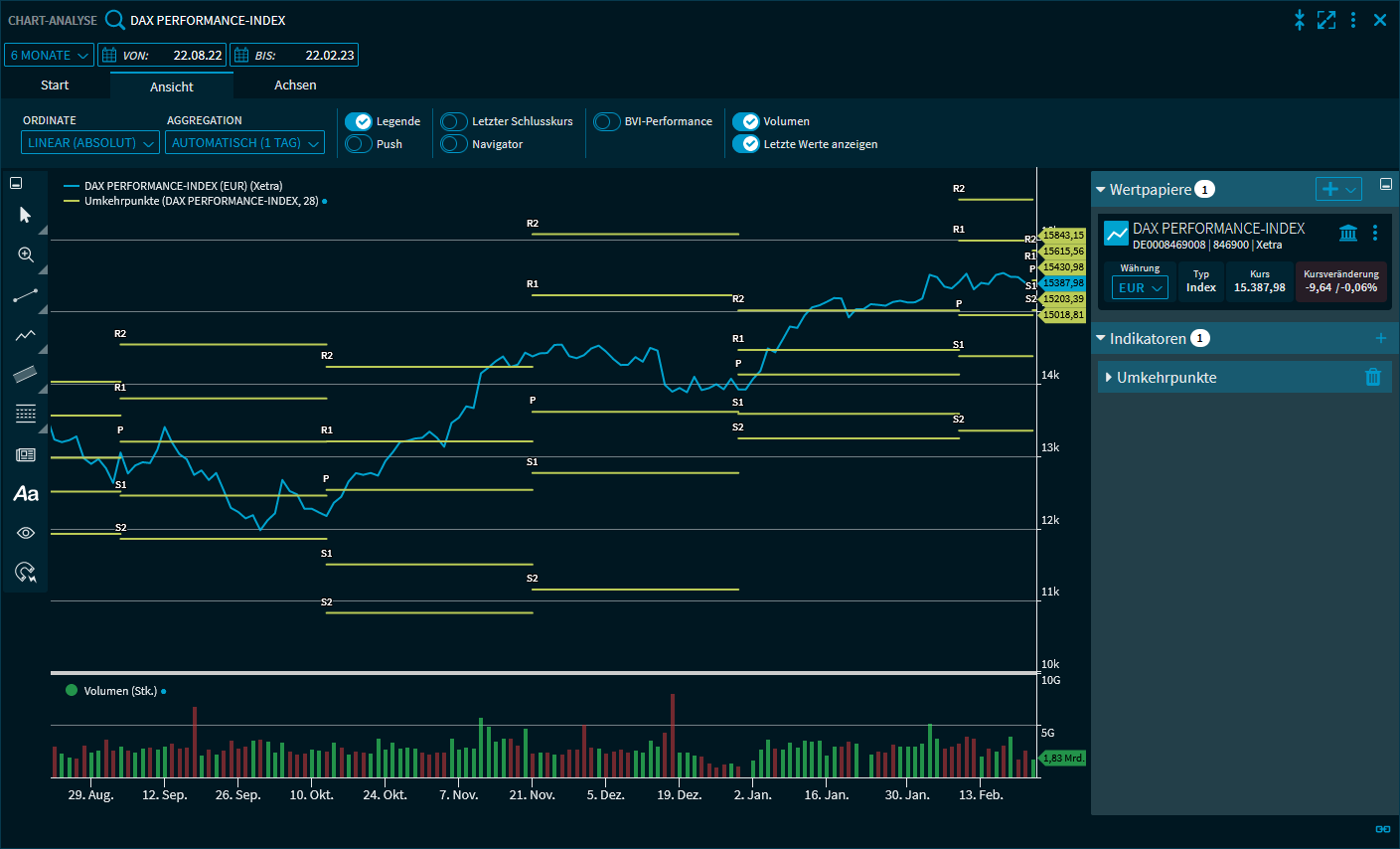 Der Indikator "Umkehrpunkte" versucht globale Trends in verschiedenen Zeitintervallen zu ermitteln. Basis ist die Ermittlung der Umkehrpunkte bzw. "Pivot Points", darüber hinaus werden für die Zeitreihe Widerstands- (R1, R2 - Resist-Linien) und Unterstützungslinien (S1, S2 - Support-Linien) eingezeichnet.