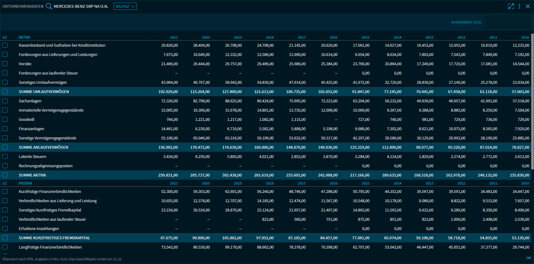 Wählen Sie den Bereich "Bilanz", um die Unternehmensbilanzen der letzten 10 Jahre anzuzeigen.