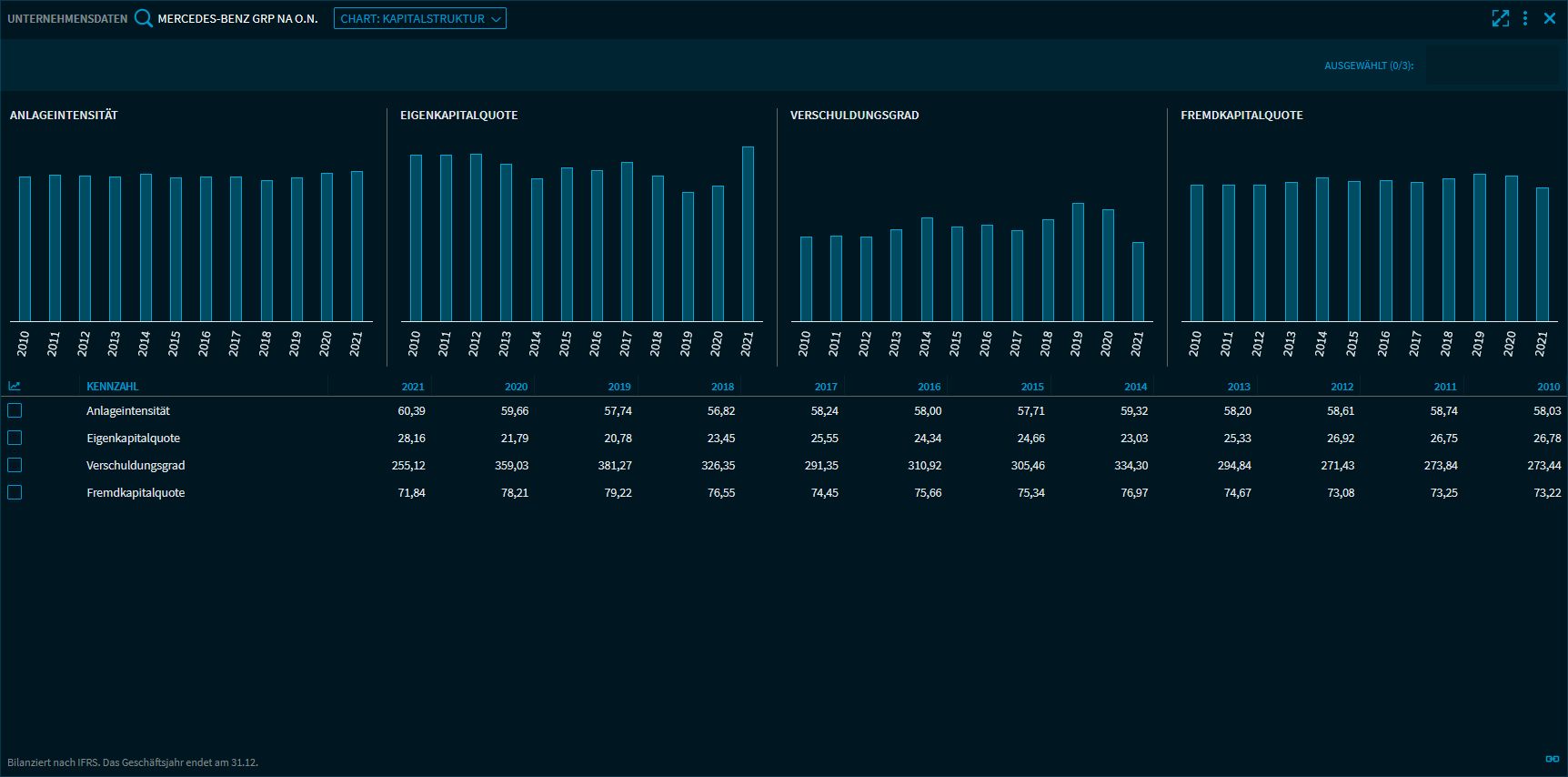 Wählen Sie den Bereich "Chart: Kapitalstruktur", um die Kapitalstruktur des Unternehmens der letzten 10 Jahre anzuzeigen. Hier werden die folgenden Kennzahlen sowohl als Tabelle als auch als Diagramm dargestellt: