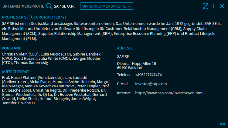 Das Widget "Unternehmensprofil" bietet einen schnellen Überblick über ein börsennotiertes Unternehmen mit einem kompakten Unternehmensprofil, Informationen zu Vorstand und Aufsichtsrat sowie Adresse und Kontaktdaten.