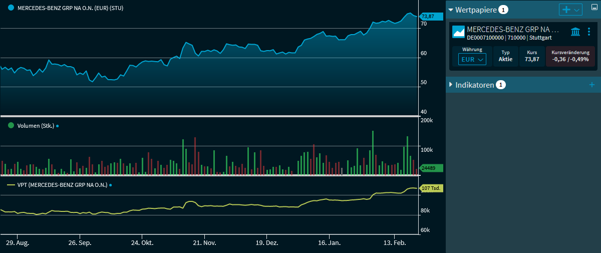 Der VPT ist verwandt mit dem Indikator "On Balance Volume", berücksichtigt aber neben der Richtung der Entwicklung eben auch die Stärke dieser Entwicklung.