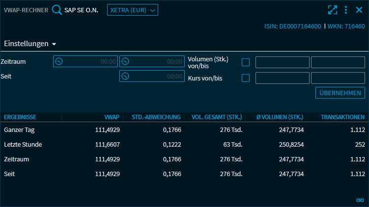 Neben dem VWAP werden Kennzahlen wie Standardabweichung, Gesamt- und Durchschnittsvolumen sowie die Anzahl der Transaktionen angegeben.