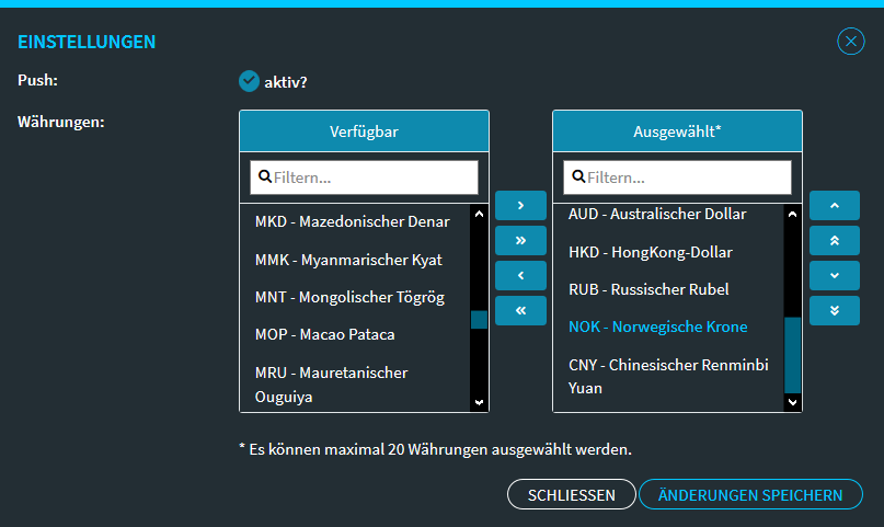 Fügen Sie nun mit einem Klick auf das Icon "→" die ausgewählte Währung "NOK – Norwegische Krone" zur Spalte "Ausgewählt*" hinzu.
