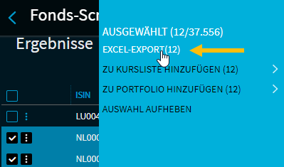 Sie können ausgewählte Wertpapiere einer Ergebnisliste nach Excel exportieren. Gehen Sie dazu wie folgt vor: