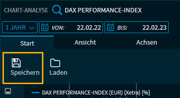 Die aktuell im Widget "Chart-Analyse" dargestellten Daten können Sie als Datei vom Typ *.json speichern. Dabei werden Einstellungen und Wertpapierinformationen exportiert. Gehen Sie wie folgt vor, um die Daten als Datei zu speichern: