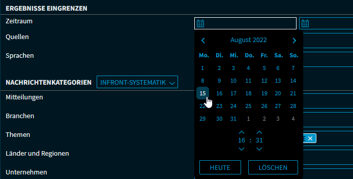 Quellen | Hier können Sie die Nachrichtensuche nach Quellen filtern. Klicken Sie dazu in das Eingabefeld und wählen Sie die gewünschte Quelle aus. Wiederholen Sie diesen Vorgang, um weitere Anbieter auszuwählen. Beispiele: