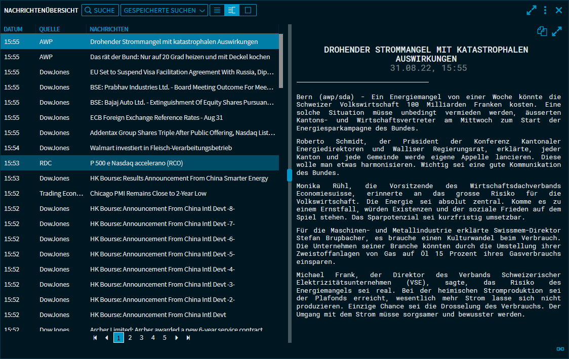 Sie können Ihre individuellen Suchkonfigurationen als Nachrichtensuche speichern, um immer wieder darauf zugreifen zu können. Darüber hinaus können Sie Ihre Nachrichtensuchen auch als Alert speichern, um beim Eintreffen passender News alarmiert zu werden.