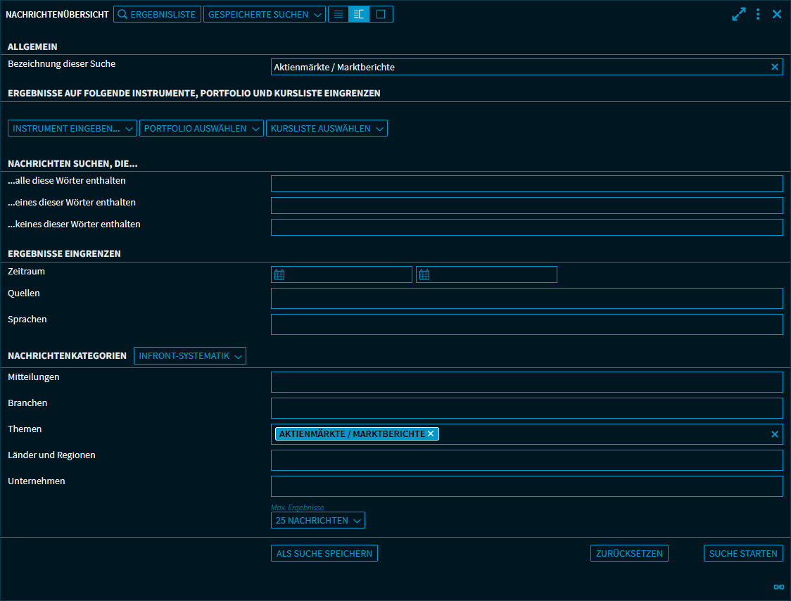 Konfigurieren Sie in der erscheinenden Ansicht Ihre Nachrichtensuche. In der folgenden Tabelle finden Sie alle Informationen zu den Suchkriterien, die Sie natürlich auch beliebig kombinieren können.