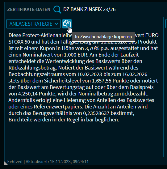 Im Widget "Zertifikate-Daten" kann die "Anlagestrategie" nun in die Zwischenablage kopiert werden.