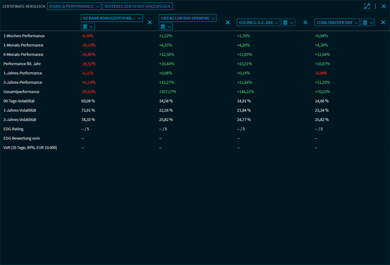 Wählen Sie in der oberen Auswahlliste die Ansicht "Risiko & Performance", dann werden die ausgewählten Zertifikate bezüglich der wichtigsten Performance- und Risikokennzahlen verglichen.