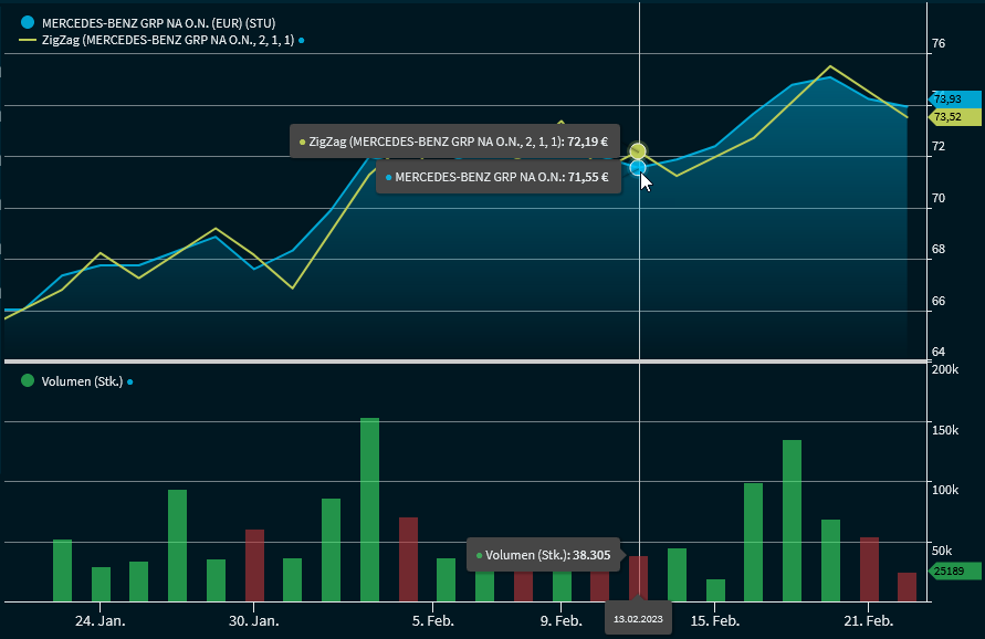 Ein ZigZag von "x%" zeichnet nur Veränderungen, die, gemessen vom Hoch zum Tief bzw. analog vom Tief zum Hoch, größer sind als "x%", kleinere Änderungen werden ignoriert. Er verbindet die Umkehrpunkte mit einer Linie. Die Richtung der Linie ändert sich erst, wenn eine dem eingestellten Prozentsatz entsprechende auf- oder abwärtsgerichtete Trendphase beendet ist. Vorhersagen allerdings scheinen nicht möglich.