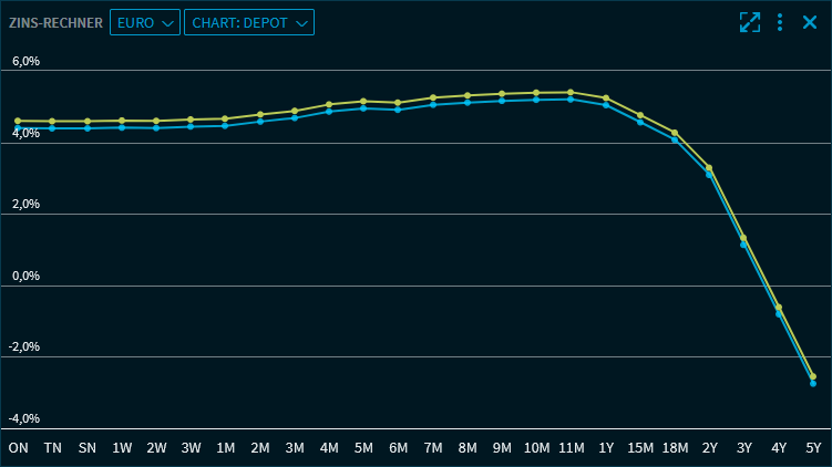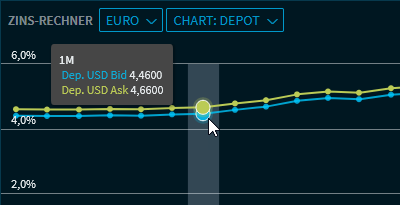 Die Zinssätze werden an der y-Achse abgelesen, die zugehörigen Zeiträume an der x-Achse. Zeigen Sie auf die Chartlinien, dann werden die entsprechenden Informationen angezeigt: