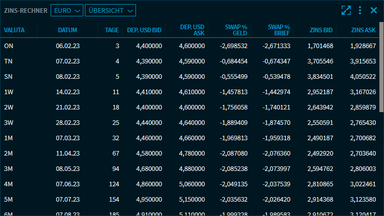 Valuta | Der Valuta-Zeitraum, die Laufzeit des Termingeschäfts. Dabei gilt: "ON" = Overnight, "TN" = Tomorrow Next, "SN" = Spot Next, "W" = Wochen, "M" = Monate und "Y" = Jahre. |