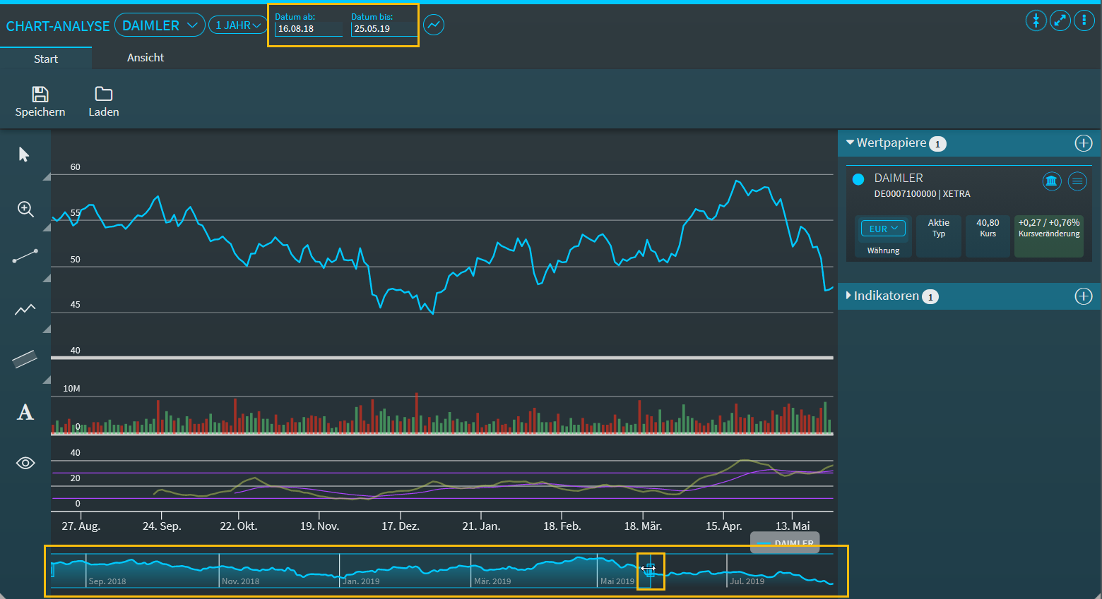 Unten im Chartfenster des Widgets "Chart-Analyse finden Sie eine Zoomleiste. das Hinein-Zoomen in einen gewählten Zeitraum erfolgt per Mausbewegung (bzw. "Streichen" auf mobilen Geräten). Dabei können Sie auch mehrmals Zoomen.