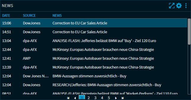 In this widget you can see the latest news on the selected share. The columns "Date", "Source" and "News" are displayed for each message by default. You can show and hide the columns via the widget settings.
