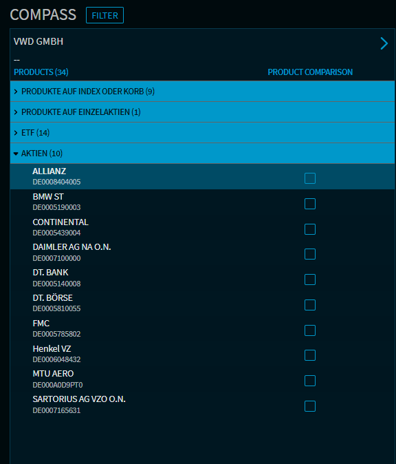Recommendation lists with the available securities can be configured individually for each client. When a product is selected, the widgets displayed in the right-hand area are updated with the securities data.
