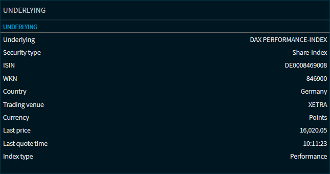 In the "Underlying" Compass widget, you will find the following values for the underlyings of the certificates: