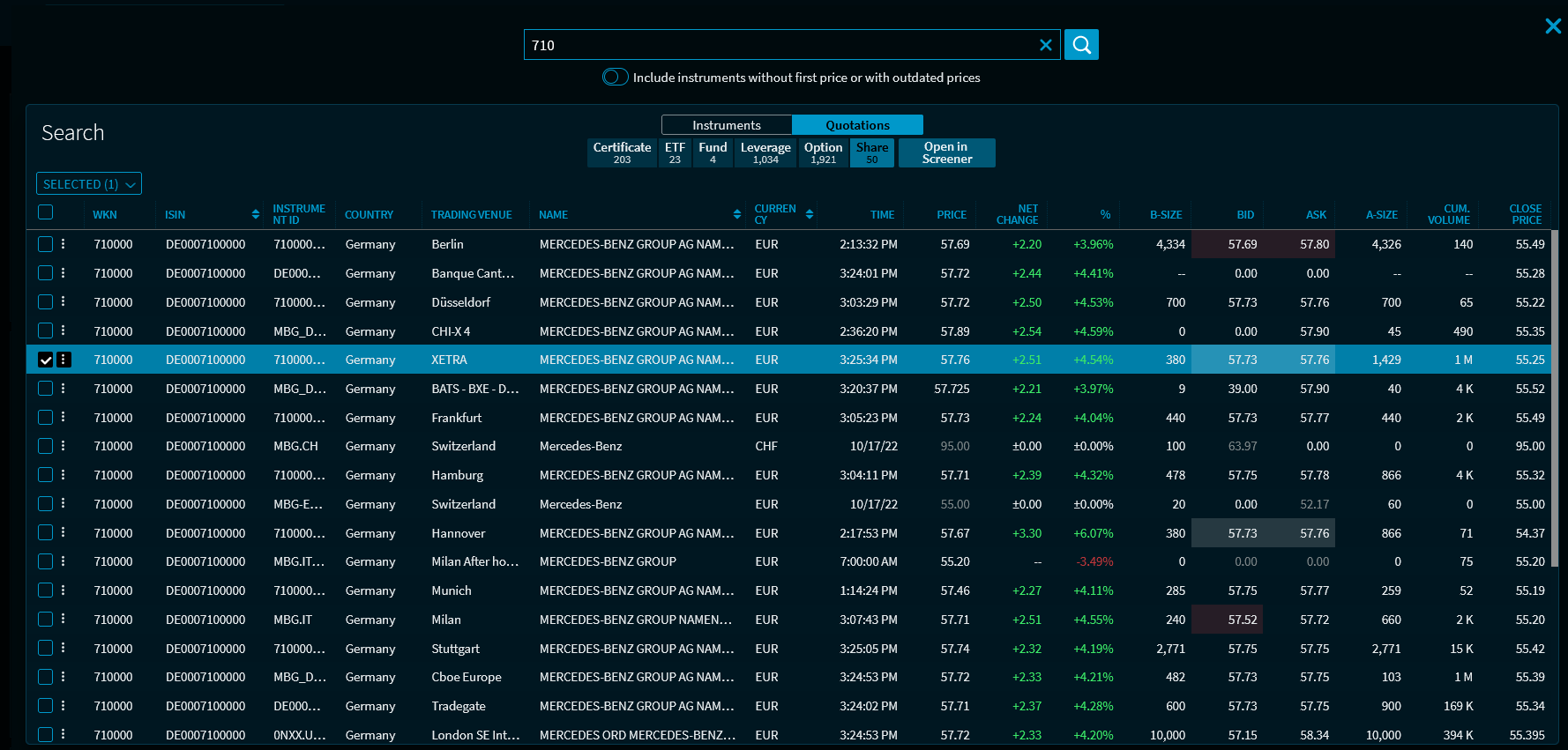 Click the "Open in screener" button to open the currently displayed search result in the corresponding Screener (in the example above, in the share screener). Use this functionality to refine your search when there is a great number of hits in the screener.