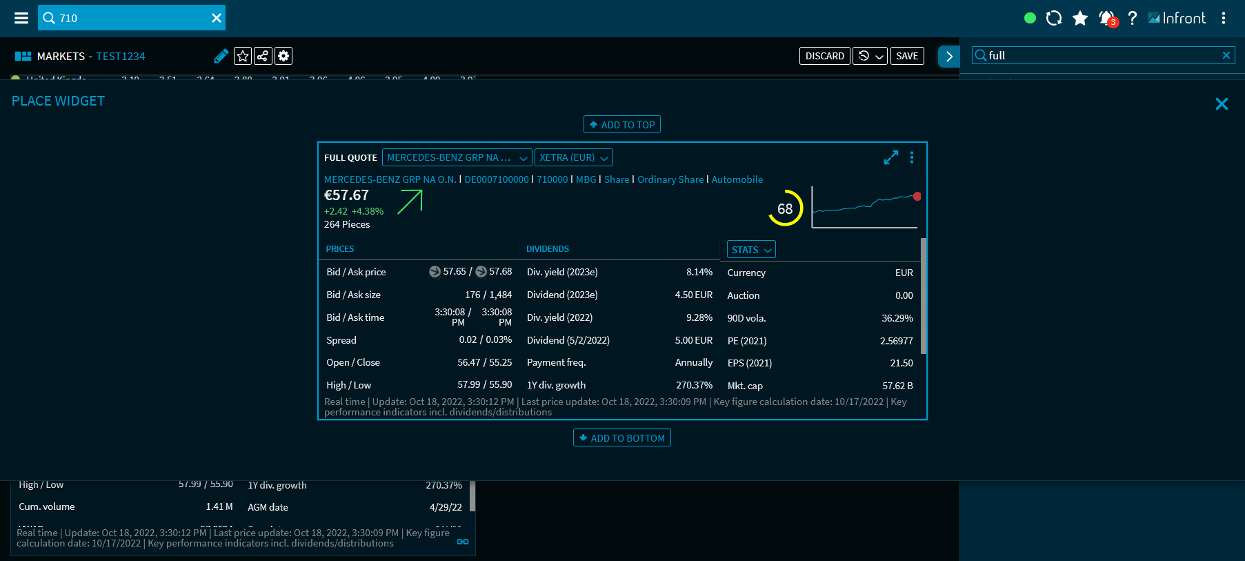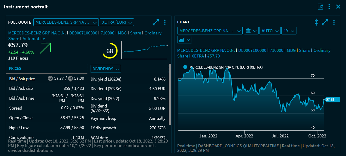 The new widget, for example, the "Full Quote" - widget, will then open at the corresponding place in the dashboard. Securities selected by clicking them are displayed in the dashboard at the selected position in a "Full Quote" widget.