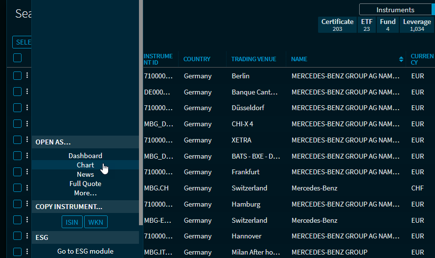 Use the menu icon to the left of each row to Security type open securities in the default dashboard for this security type. The usual commands for opening the instrument in other widgets (chart, news...) are also available. Use the alert icon at the bottom of the "Tools" area to switch directly to the "Price alert" dialogue window. Commands are also available to open the security in Compass or the ESG module.