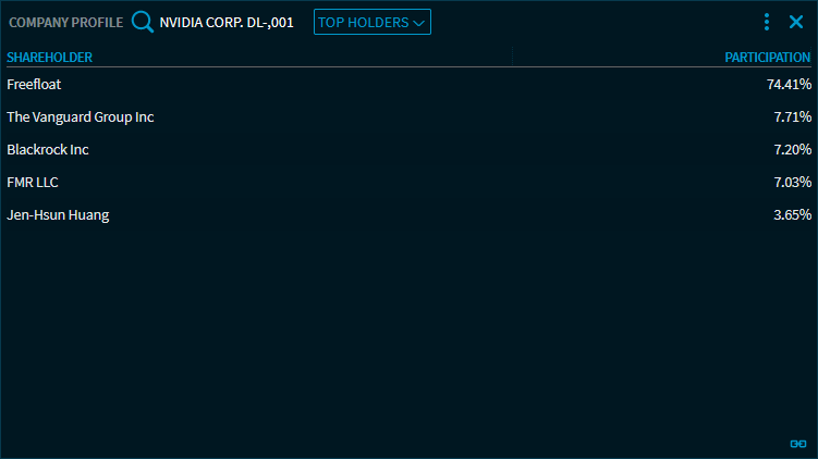 Select the "Top Holders" view at the top of the "Company Profile" widget to display the list of the largest shareholders of the selected (listed) security or company.