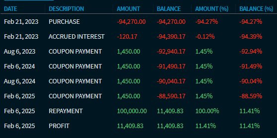 When you select the "Cash flow" view from the "Figures" drop-down list, you see all relevant cash flows during the holding period or time to maturity of the bond.