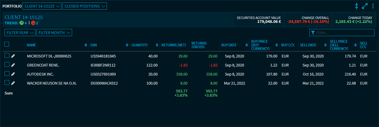The sum of the columns "Returns (net)" and "Returns (gross)" are calculated both as absolute values (in portfolio currency) and as percentage values. By means of "Filter year" and "Filter month", the investment success of the positions closed in the previous year can be analysed, for example. |