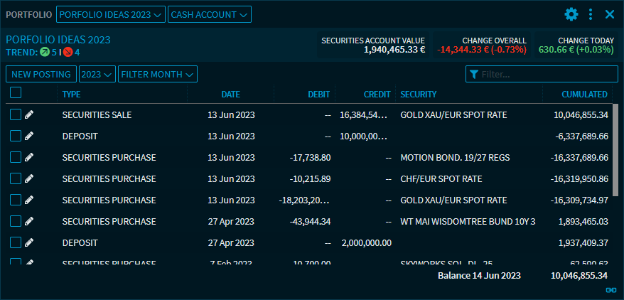"Security" column | If the posting is associated with a security (buy, sell, dividend...), then this column shows the name of the security. |