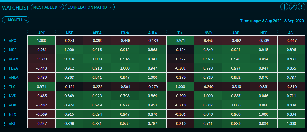 Select the "Correlation Matrix" view to show the securities included in the watchlist as a correlation matrix.
