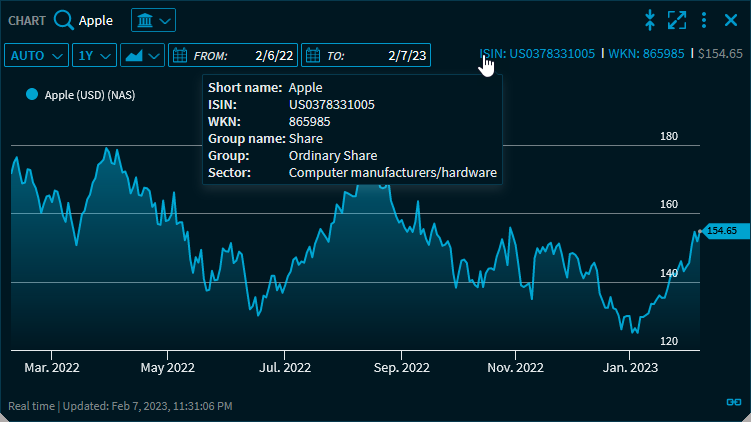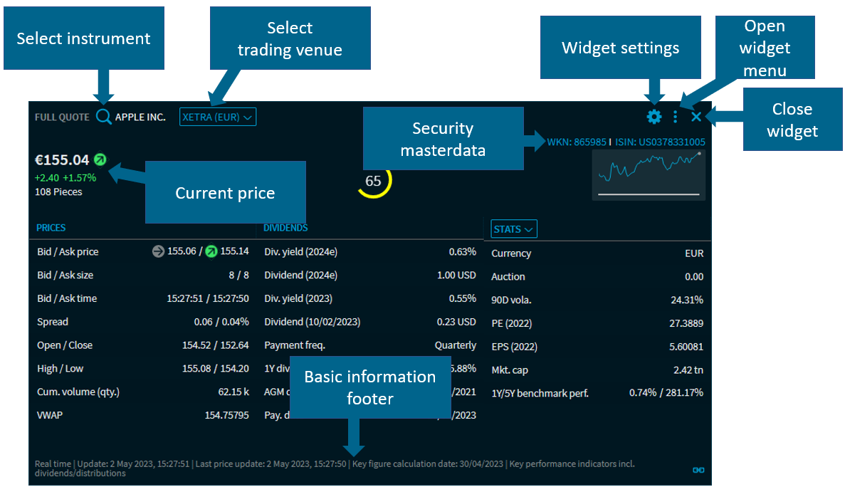 Security master data | in the upper right corner of the widget selection, you will find further information on the currently selected security, for example in a "Full Quote" widget: