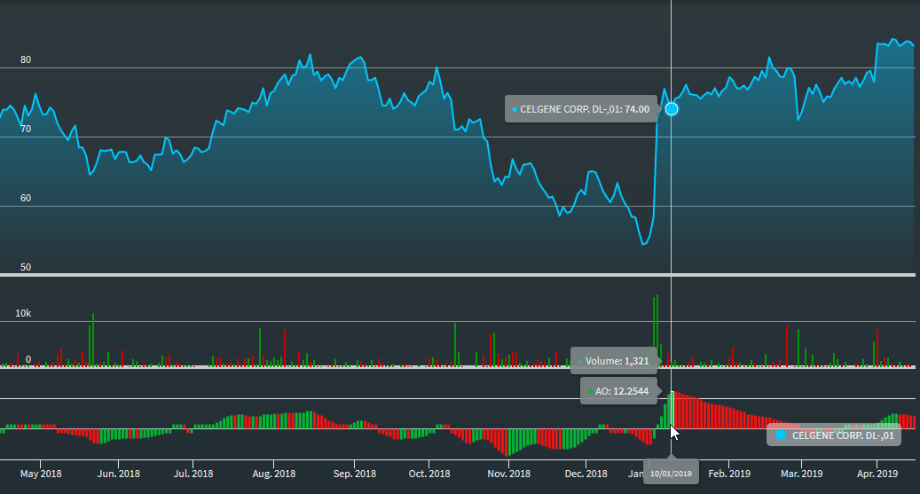 The Awesome Oscillator is displayed as a histogram. Rising trends are visualised with green bars and falling trends with red ones. For example, if the zero line is broken through from below, we can assume the end of a downward trend and so on.