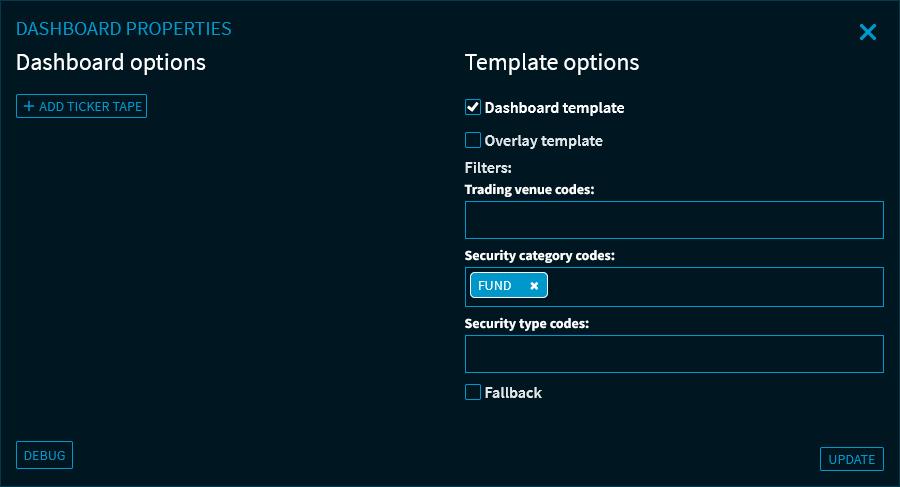 Now set the template options in the "Dashboard properties" dialogue window, for example "Funds" as the security category codes.